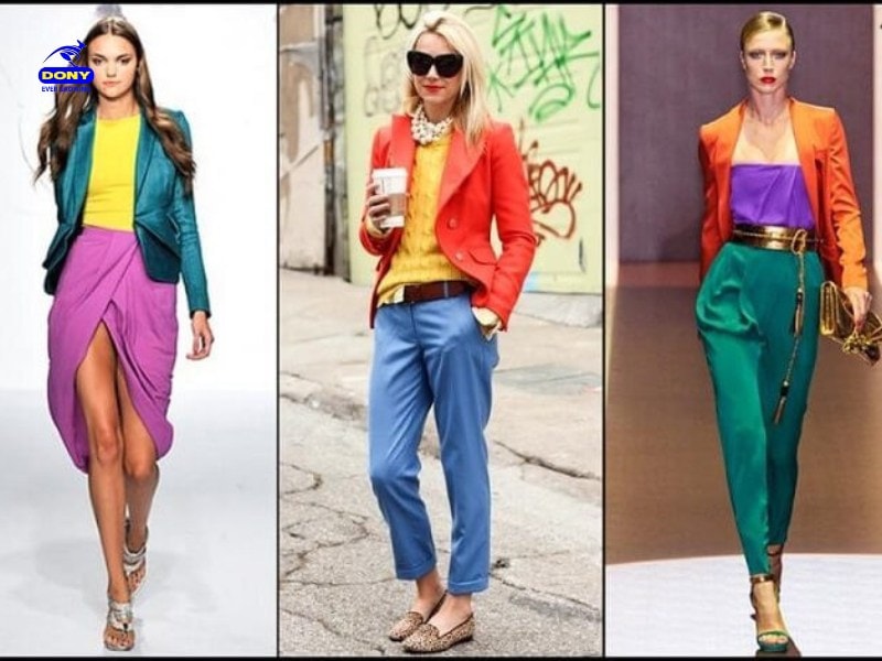 - Color blocking: Phối các màu đối lập trên bánh xe màu sắc để tạo hiệu ứng nổi bật (xanh-cam, tím-vàng).